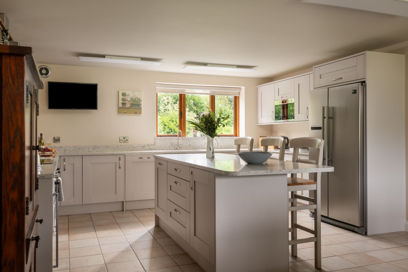 • Kitchen with two electric ovens, electric hob, microwave, american fridge/freezer, dishwasher and breakfast bar
